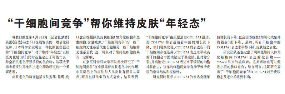 2019-04-12 查看更多科技日報北京4月3日電(記者張夢然)英國《自然》雜志3日在線發(fā)表的一項老化研究稱,日本科學(xué)家發(fā)現(xiàn)由一種膠原蛋白驅(qū)動的“干細胞…