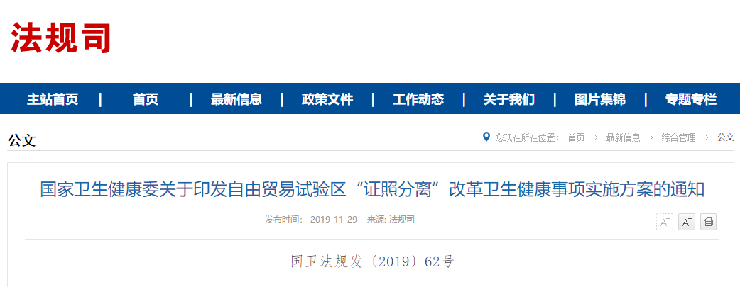 2019-12-19 查看更多近日,國家衛(wèi)健委發(fā)布《關(guān)于印發(fā)自由貿(mào)易試驗區(qū)“證照分離”改革衛(wèi)生健康事項實施方案的通知》(以下簡稱《通知》),公布12個醫(yī)改實施方案。此次衛(wèi)生健康領(lǐng)域的“證照分離”是要貫徹落實《國務(wù)院關(guān)于在自由貿(mào)易試驗區(qū)開展“證照分離”改革全覆蓋試點的通知》…