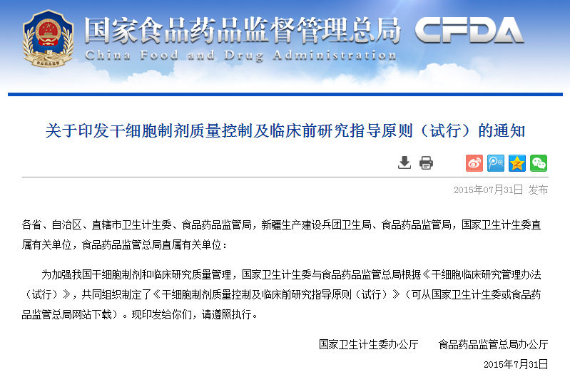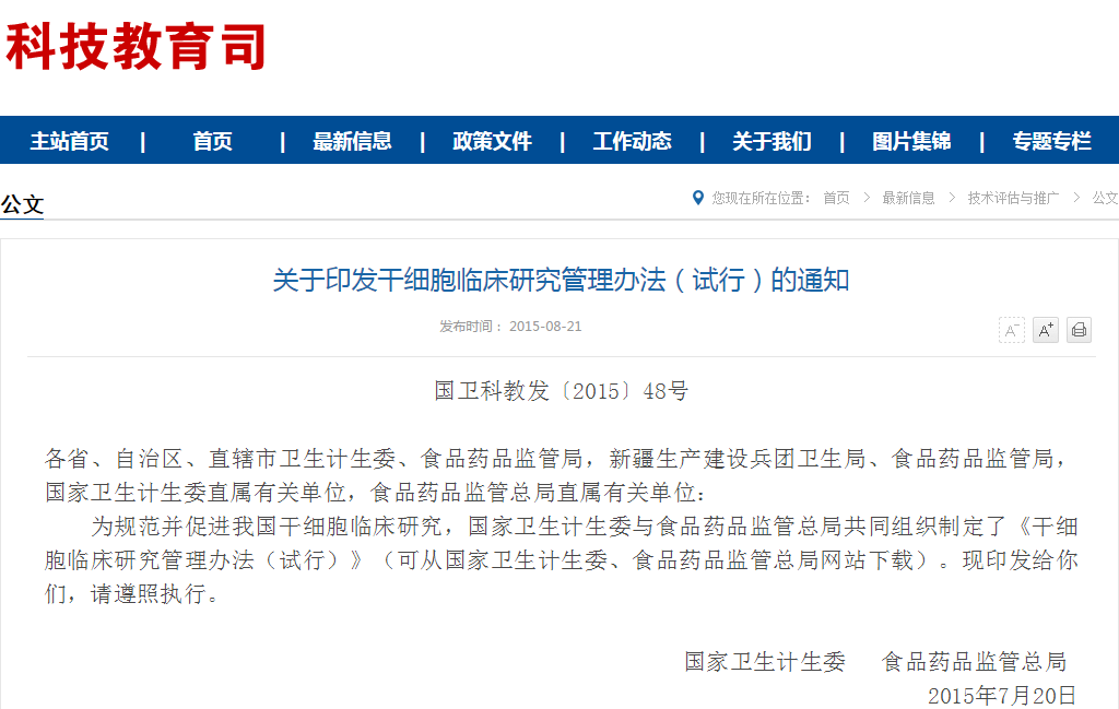 2015-07-31 查看更多各省、自治區(qū)、直轄市衛(wèi)生計生委、食品藥品監(jiān)管局,新疆生產(chǎn)建設(shè)兵團衛(wèi)生局、食品藥品監(jiān)管局,國家衛(wèi)生計生委直屬有關(guān)單位,食品藥品監(jiān)管總局直屬有關(guān)單位: 為規(guī)范并促進我國干細胞臨床研究,國家衛(wèi)生計生委與食品藥品監(jiān)管總局共同組織制定了《干細胞臨床…