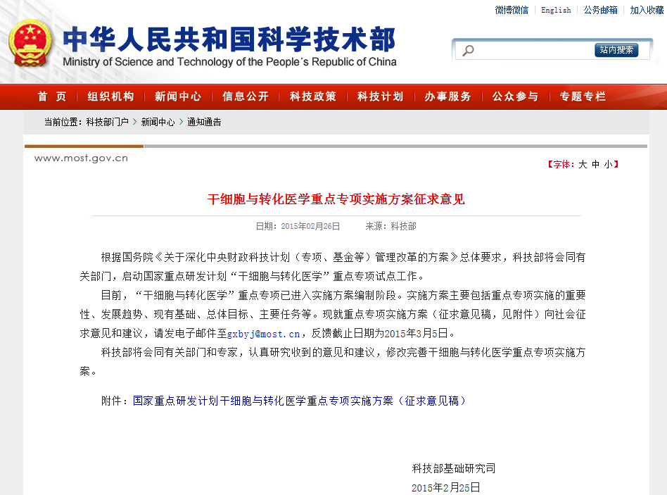 2015-08-28 查看更多干細胞與轉(zhuǎn)化醫(yī)學(xué)重點專項實施方案征求意見 根據(jù)國務(wù)院《關(guān)于深化中央財政科技計劃(專項、基金等)管理改革的方案》總體要求,科技部將會同有關(guān)部門,啟動國家重點研發(fā)計劃“干細胞與轉(zhuǎn)化醫(yī)學(xué)”重點專項試點工作。 目前,“干細胞與轉(zhuǎn)化醫(yī)學(xué)”重點專項已進入…